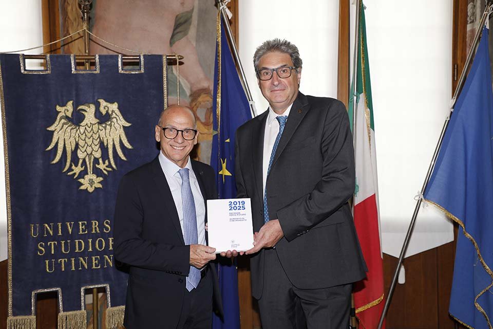 “Decidere per il futuro”. È il titolo del “Rapporto di fine mandato” del rettore dell’Università di Udine, Roberto Pinton, a conclusione dei sei anni al vertice dell’Ateneo, iniziati il 1° ottobre 2019. Il lavoro è un rendiconto delle principali attività svolte, dei risultati raggiunti e delle sfide affrontate assieme alla comunità universitaria: docenti, personale, studenti e tutti coloro che, a vario titolo, hanno contribuito alla crescita dell’università. Uno strumento di riflessione sull’operato dell’Ateneo e una concreta base di ragionamento per le future scelte strategiche. A presentarlo sono stati, oggi, il rettore Pinton e il prorettore Andrea Cafarelli nel Salone d’onore di Palazzo Antonini Maseri, sede del rettorato.